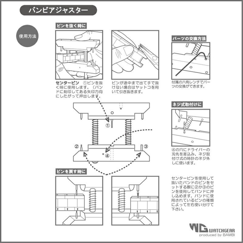ピンを戻すとき…2.か3.左右どちらかのピンを使用してベルトへ押し込みます。ベルトに使用されているピンの種類や太さにしたがって使い分けてください。