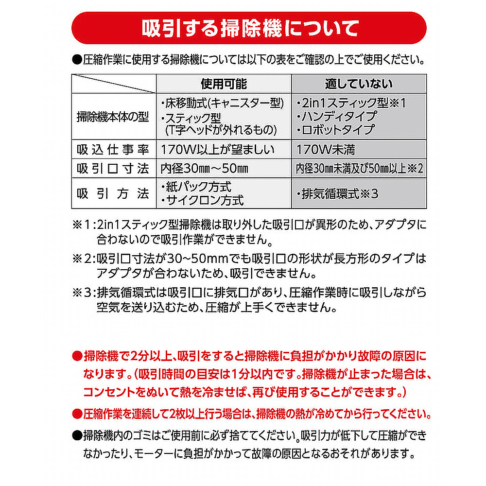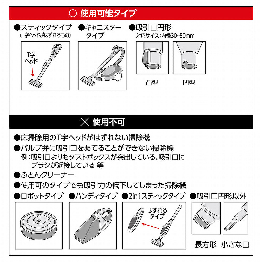 床用のT字ヘッドが取り外せない掃除機、バルブ弁に吸引口を当てることができない掃除機、ふとんクリーナー、使用可能なタイプでも吸引力の低下してしまった掃除機、ロボットタイプ、ハンディタイプ、2in1スティックタイプ、吸引口が円形でないタイプには使用できません。