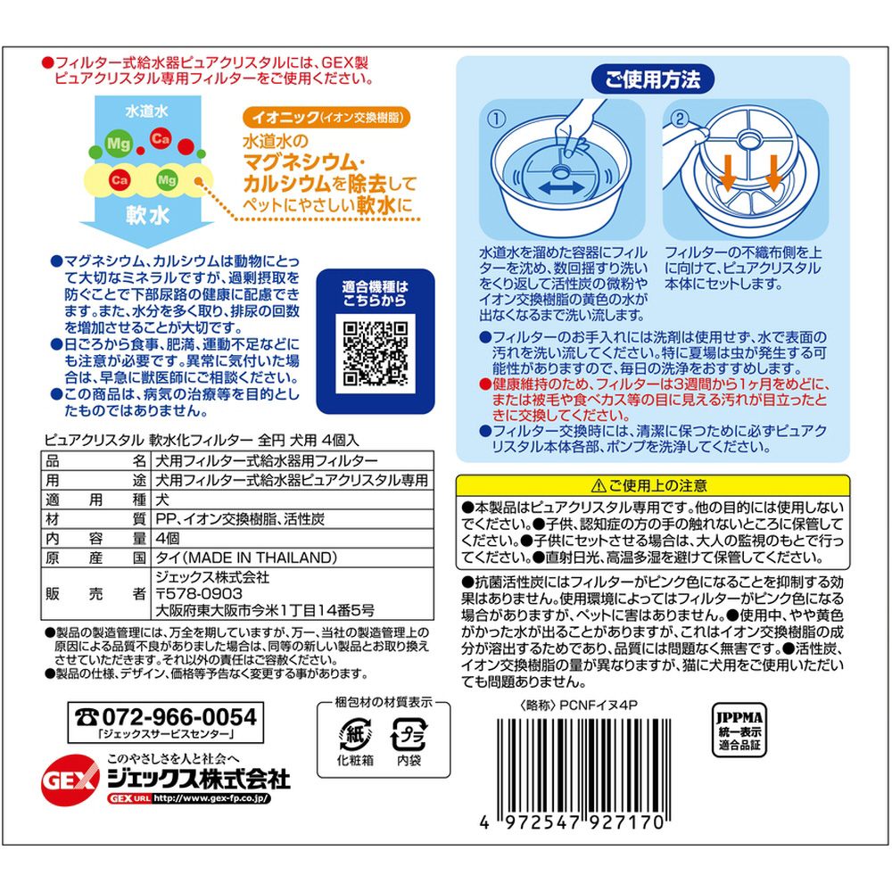 ・不織布で気になる食べカス、抜け毛、ホコリなどをキャッチ。・活性炭(抗菌活性炭素は配合)でカルキ臭を吸着しキレイを維持します。・イオニック(イオン交換樹脂)が、水道水のマグネシウム・カルシウムを除去してペットにやさしい軟水に