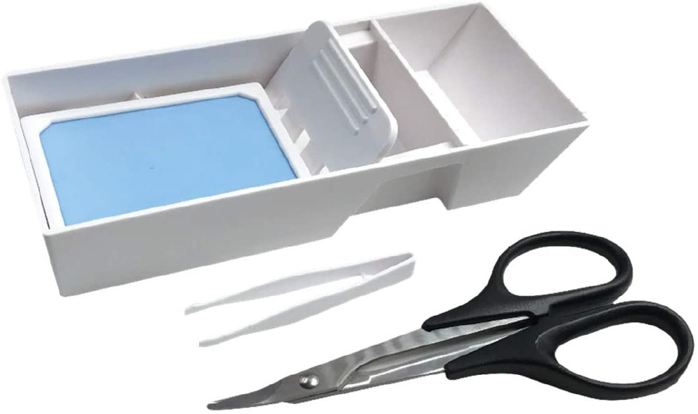 特殊設計のスポンジプレートや、貼り付け後に残る台紙を捨てるスペース、水こぼし防止のすべり止め、ピンセットを収納できるフックなど、作業に便利なギミックが沢山ついています。