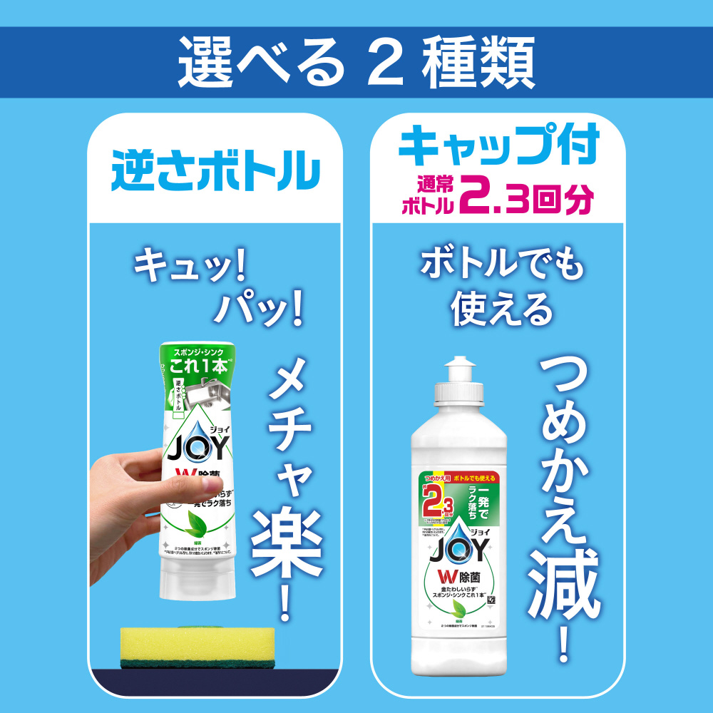 NEW! 洗浄力・除菌力・すすぎの黄金比ジョイ誕生。すべての便益を最高レベルに実現した食器用洗剤。“めちゃ楽 逆さボトル”なら、キュッ!と押すだけ。ボトルをひっくり返す手間なし!蓋の開閉なし!