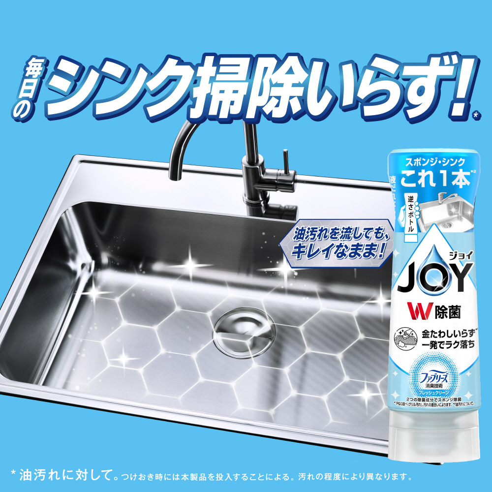 NEW! 洗浄力・除菌力・すすぎの黄金比ジョイ誕生。すべての便益を最高レベルに実現した食器用洗剤。“めちゃ楽 逆さボトル”なら、キュッ!と押すだけ。ボトルをひっくり返す手間なし!蓋の開閉なし!ファブリーズ共同開発の消臭テクノロジーがニオイを除去します。