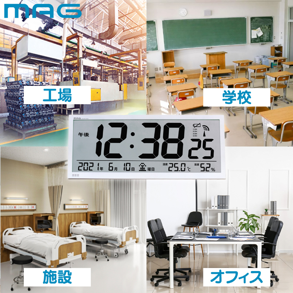 オフィス、病院、介護ケアセンター、学校、学習施設の室内で、現在の時刻をひと目で確認できる横幅55cmの大型デジタル壁掛け時計。