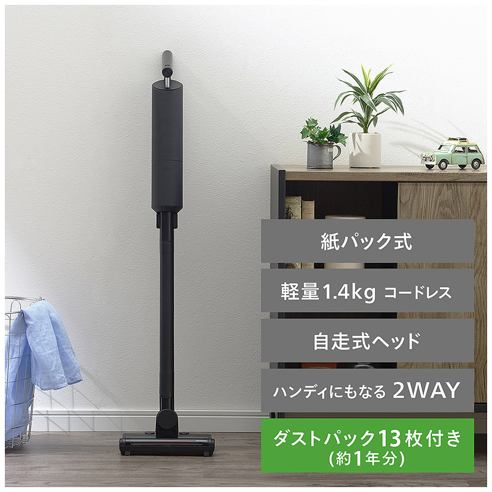 お部屋の汚れに気がついた時すぐに掃除できる、使いやすさを備えた紙パック式のコードレススティック型クリーナーです。