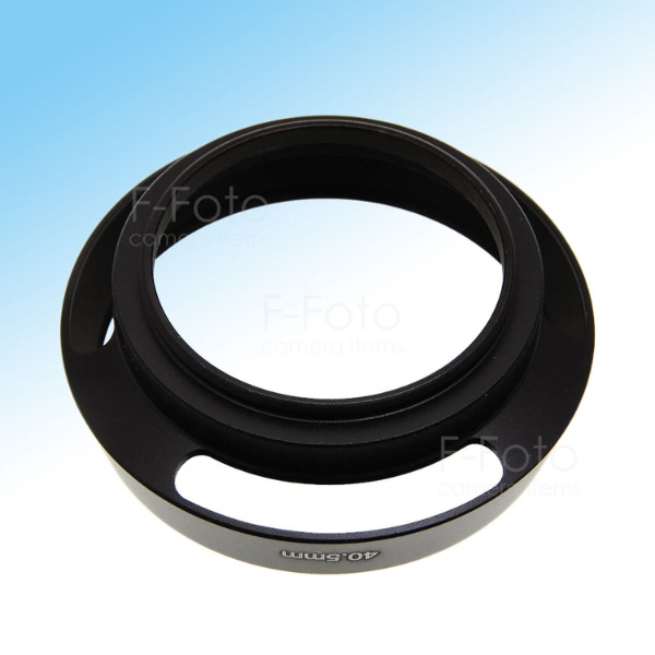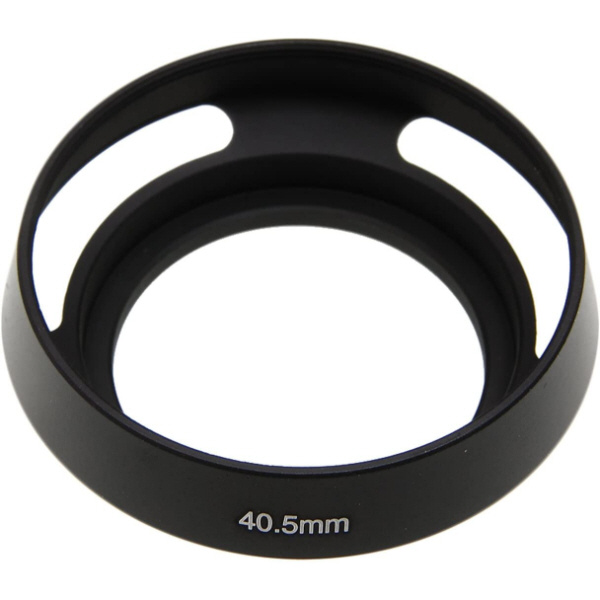 ライカ風のクラシックな外観の汎用穴開きメタルレンズフード40.5mmです。金属製で表面は半光沢のブラック塗装、内側は内面反射を防ぐため、つや消しの黒色塗装がなされています。35mm判換算で焦点距離35mm以上のレンズ用です。対応ねじ直径は40.5mmで、取り付けはねじ込み方式となります。最大外径59mm、最小内径40.5mm、高さ約21mm。フード内部に40.5mm径のレンズキャップを取付可能です。フード先端は、ネジ切り処理がされておりますので、本製品を取り付けたままフード先端に52mm径のフィルターやレンズキャップを装着することが可能です。各社40.5mm径レンズに装着可能です。フードのスリット穴数は3穴になります。