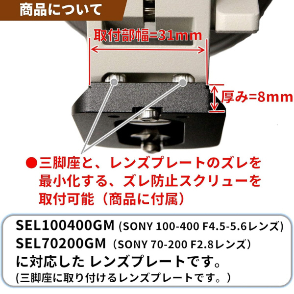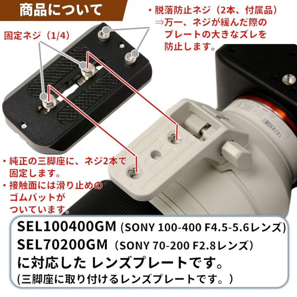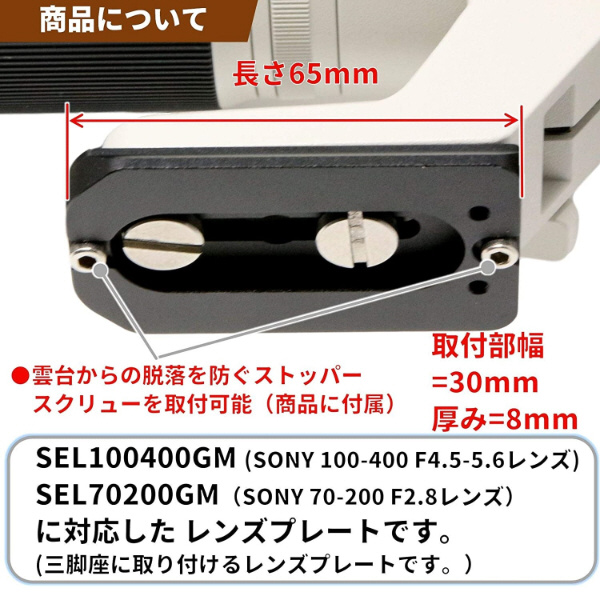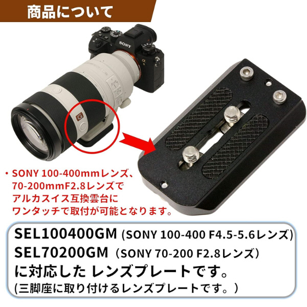 SONY ソニー 望遠ズームレンズ FE 100-400mm f/4.5-5.6 GM OSS (SEL100400GM) レンズと FE 70-200mm f/2.8 GM OSS(SEL70200GM)に対応した アルカスイス互換形状のレンズプレートです。SEL100400GMとSEL70200GMの純正三脚台座は共通なので、このレンズプレートでどちらのレンズにも使用可能です。該当レンズは雲台に取り付ける際は、ネジ止め式ですが、本品を使用する事で、ワンタッチで雲台への取付、取外しが可能となります。