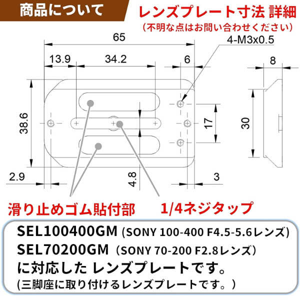 SONY ソニー 望遠ズームレンズ FE 100-400mm f/4.5-5.6 GM OSS (SEL100400GM) レンズと FE 70-200mm f/2.8 GM OSS(SEL70200GM)に対応した アルカスイス互換形状のレンズプレートです。SEL100400GMとSEL70200GMの純正三脚台座は共通なので、このレンズプレートでどちらのレンズにも使用可能です。該当レンズは雲台に取り付ける際は、ネジ止め式ですが、本品を使用する事で、ワンタッチで雲台への取付、取外しが可能となります。純正の三脚座の底面寸法に合わせた専用品です。アルカスイス形状は規格でしっかり規定されている形状ではありませんので、一部の製品(特にロックがレバー式の製品)で取り付けられない例がございます。取付を確認している雲台は、RRS BH-30、Leofoto G4、ARCA-SWISS P0 hybrid、バンガード BH-50、Neewer ボールヘッド、TYCKA 自由雲台、Neewer QRクランプ、SUNWAYFOTO DLC-60LX、RRS B2-LR II(クランプを止める際に力が要るという情報あり)。取り付けできない雲台は、マンフロット MHXPRO-BHQ6、SUNWAYFOTO DLC-60L、Leofoto LR-50、GITZO GH3382QD(プレートの脱落防止ネジが当たります) 材質はアルミ製で切削加工後に硬質アルマイト仕上でブラックに着色されています。アルミブロックから削り出しで作成しておりますので、剛性が高く大変しっかりとした作りです。レンズプレートの詳細寸法を開示しておりますので、SEL100400GM / SEL70200GM レンズのみではなく、お手持ちのレンズの三脚台座と、レンズプレートの寸法がマッチするようでしたら、他のレンズにも使用する事は可能です。取付ネジとして1/4ネジが2本組み込まれておりますが、それぞれを取り外したり、入れ替えたりする事も可能です。