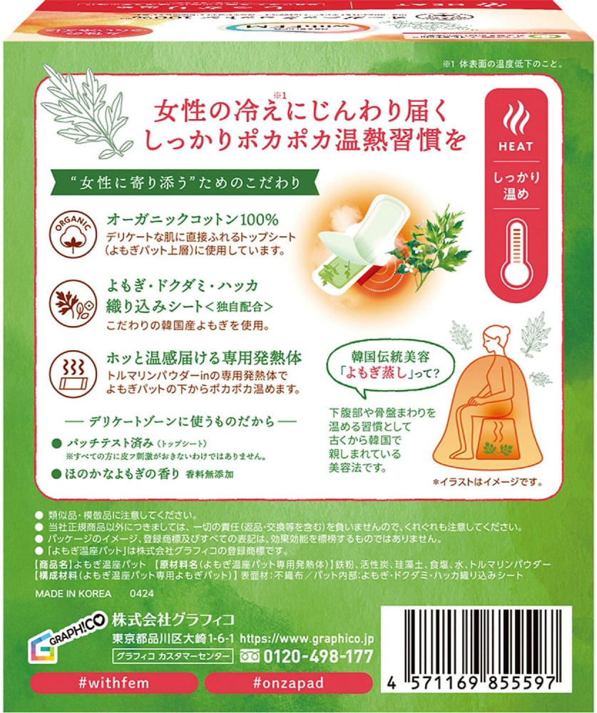with FEM(ウィズフェム)よもぎ温座パット オーガニック (HEAT)しっかり温め 6回分