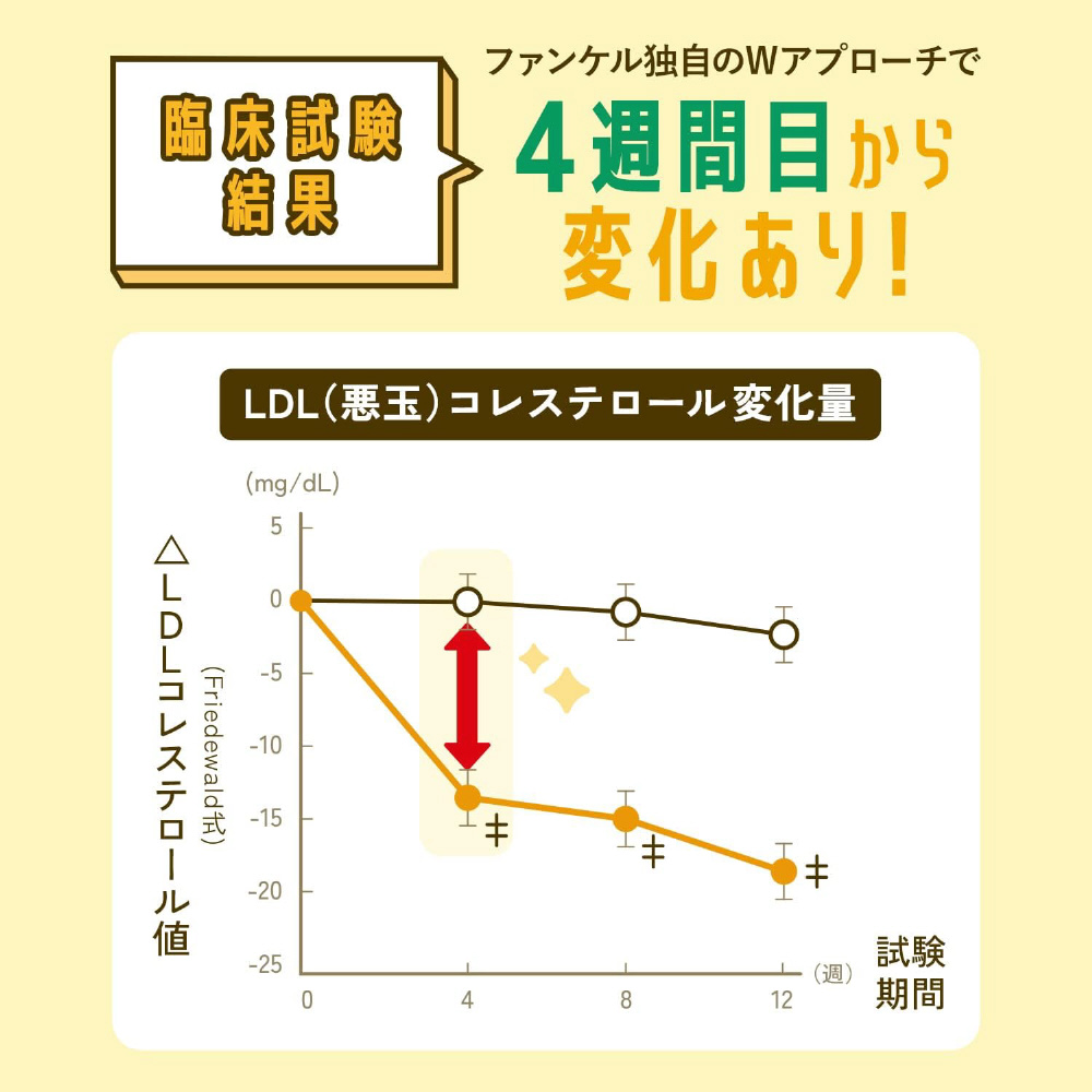 臨床試験で高めのLDLコレステロール、総コレステロール、LH比、non-HDLコレステロールが4週目から下がることを確認!