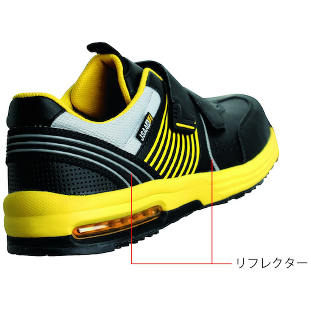 【特長】●人体に溜まった静電気を靴底全体から逃がします。●大型エアクッションが、かかとの衝撃を吸収します。●軽量で幅広のワイド樹脂先芯です。●光を反射するリフレクタ付です。