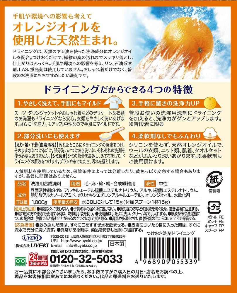 成分 界面活性剤(34%アルキルエーテル硫酸エステルナトリウム、アルキル硫酸エステルナトリウム、脂肪酸アルカノールアミド、ポリオキシエチレンアルキルエーテル)、オレンジオイル、水軟化剤
