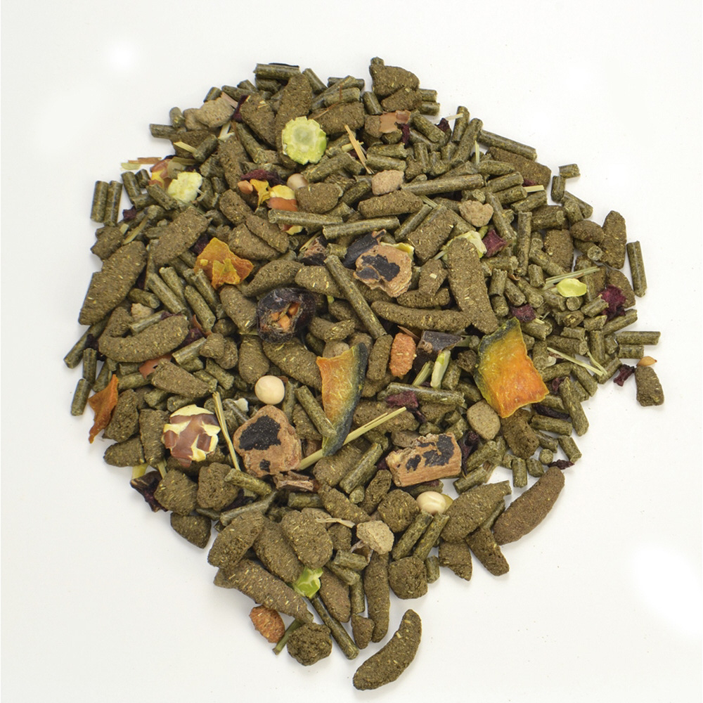 ・栄養供給と食事の楽しみ:十数種類の牧草や野草を栄養バランスを考えて配合したペレットと、五感で楽しむ風味豊かな自然素材をブレンド