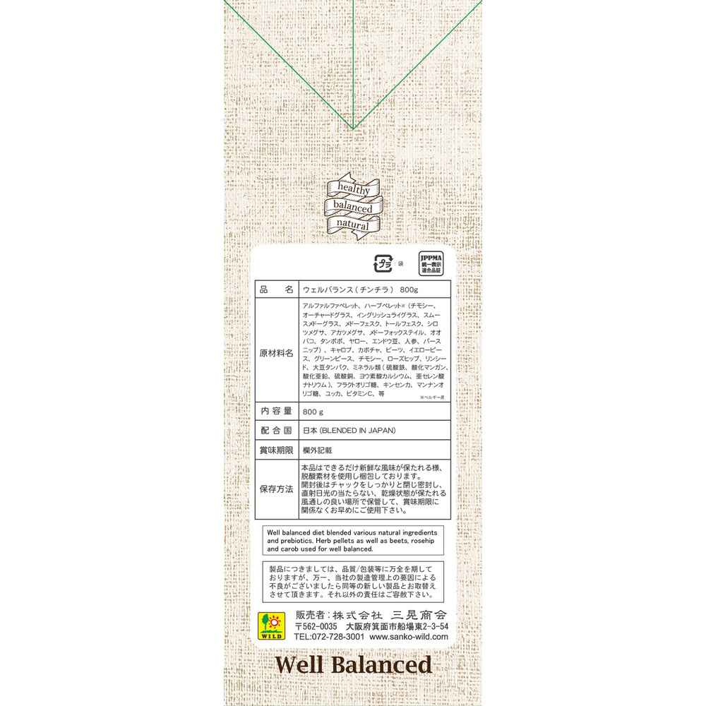 ●原材料:アルファルファペレット、ハーブペレット※(チモシー、オーチャードグラス、イングリッシュライグラス、スムースメドーグラス、メドーフェスク、トールフェスク、シロツメグサ、アカツメグサ、メドーフォックステイル、オオバコ、タンポポ、ヤロー、エンドウ豆、人参、パースニップ)、キャロブ、カボチャ、ビーツ、イエローピース、グリーンピース、チモシー、ローズヒップ、リンシード、大豆タンパク、ミネラル類(硫酸鉄、酸化マンガン、酸化亜鉛、硫酸銅、ヨウ素酸カルシウム、亜セレン酸ナトリウム)、フラクトオリゴ糖、キンセンカ、マンナンオリゴ糖、ユッカ、ビタミンC、等(※自然な素材を使用しています。含有成分等は季節・ロットにより表記と異なる場合があります)
