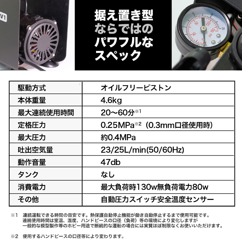 ■かなり余裕のあるスペックにより模型製作などのホピー用途であれば使用するハンドピースや塗料の種類の幅がかなり広がります。