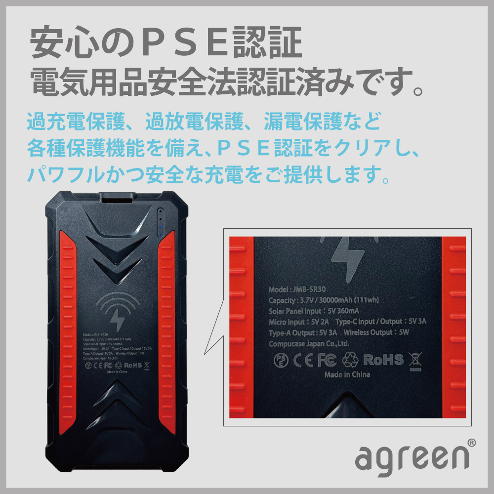 ●ソーラーパネル付きなので、防災/キャンプで活躍します! バッテリー大容量30000mAh表面に搭載されたソーラーパネルへ太陽光を当てることで本体に蓄電することが出来ます。●防水、耐衝撃、防塵仕様 IP54 ●電源が無くても本体に充電が出来ます。ソーラーパネル付きなので、太陽光を当てることで本体に蓄電出来ます。●高輝度ライト付き 夜道や停電時で懐中電灯代わりに暗闇を照らしてくれるほか、地震や台風など緊急時の救難信号として役立ちます。●USBケーブルが無くても充電出来ます。 ワイヤレスチャージャー機能付きなので、USBケーブルが無くても充電可能です。