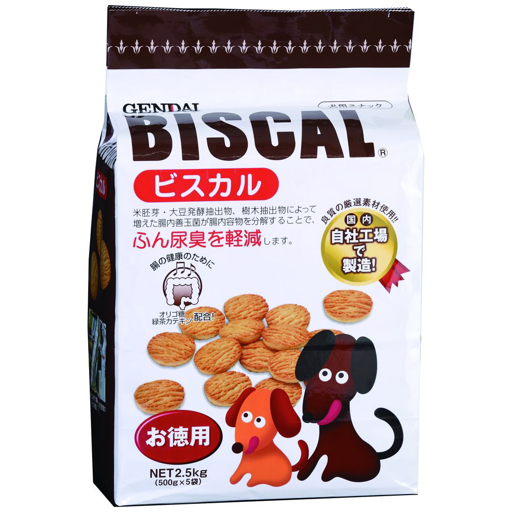 米胚芽・大豆発酵抽出物、樹木抽出物(成分である発酵多糖類が腸内の細菌叢を正常化することで、悪臭の発生を抑制します)が気になるふん尿臭を軽減する栄養ビスケット。毎日与えていただくことで3〜4日頃よりふん尿臭が軽減する犬用スナックです。500g×5袋入り。