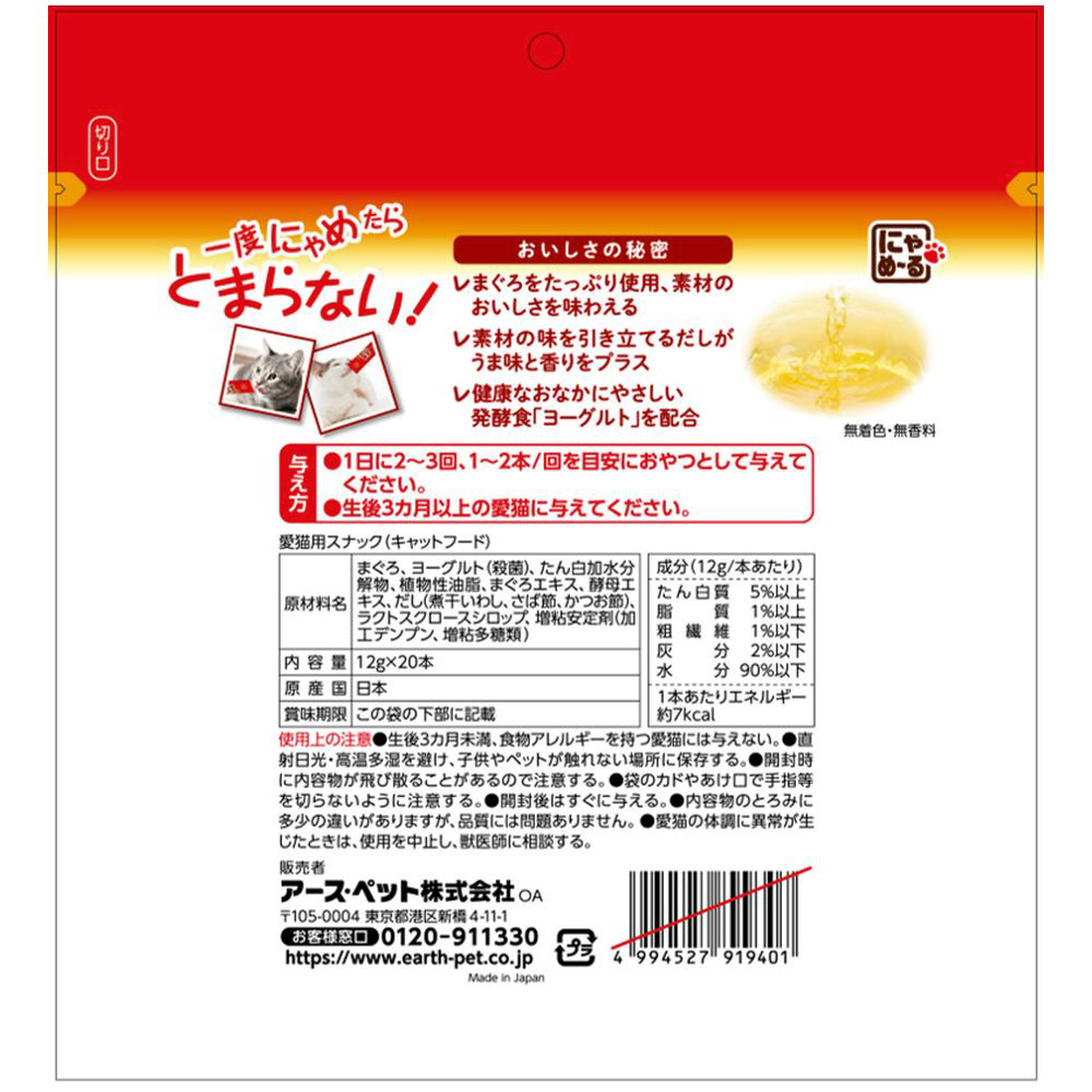 まぐろそのものの味をしっかり味わえる液状おやつ。素材の味を引き立て、うま味と香りが広がるだし入りだから、一度にゃめたらとまらないおいしさ。健康なおなかにやさしい発酵食「ヨーグルト」を配合。