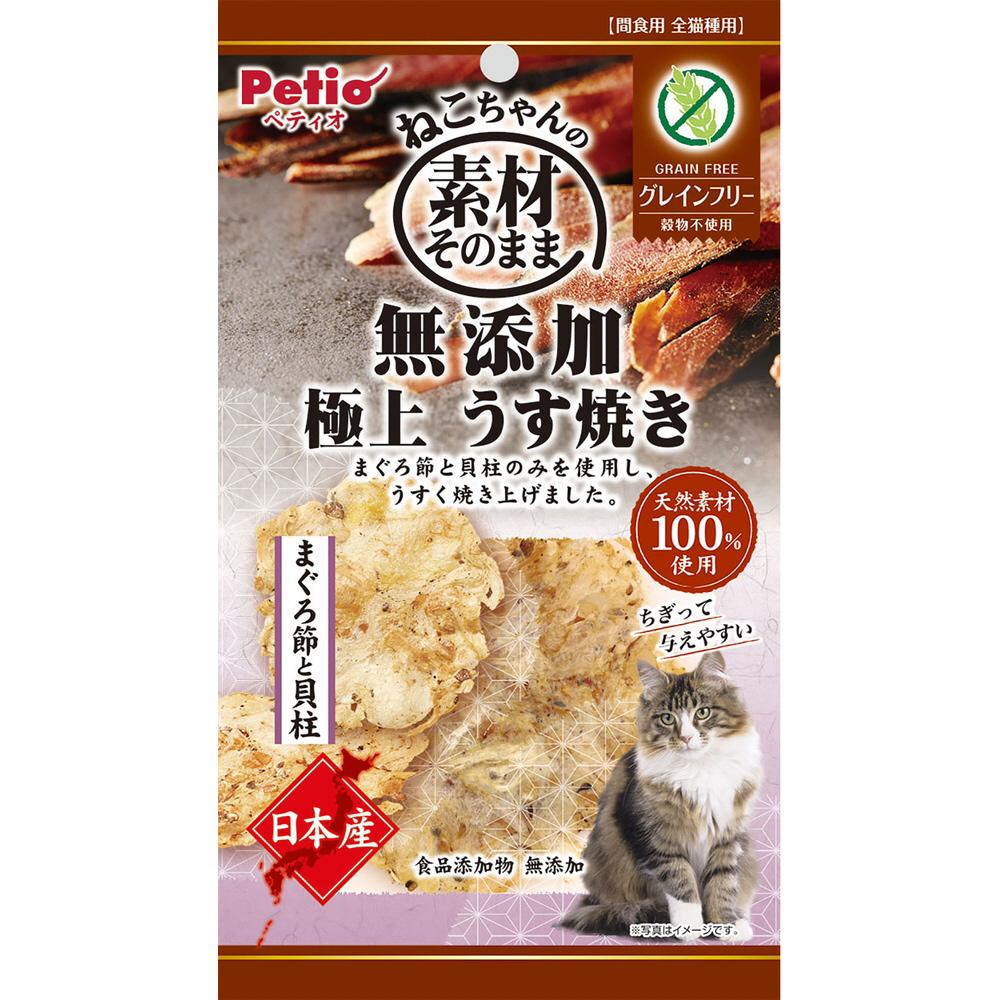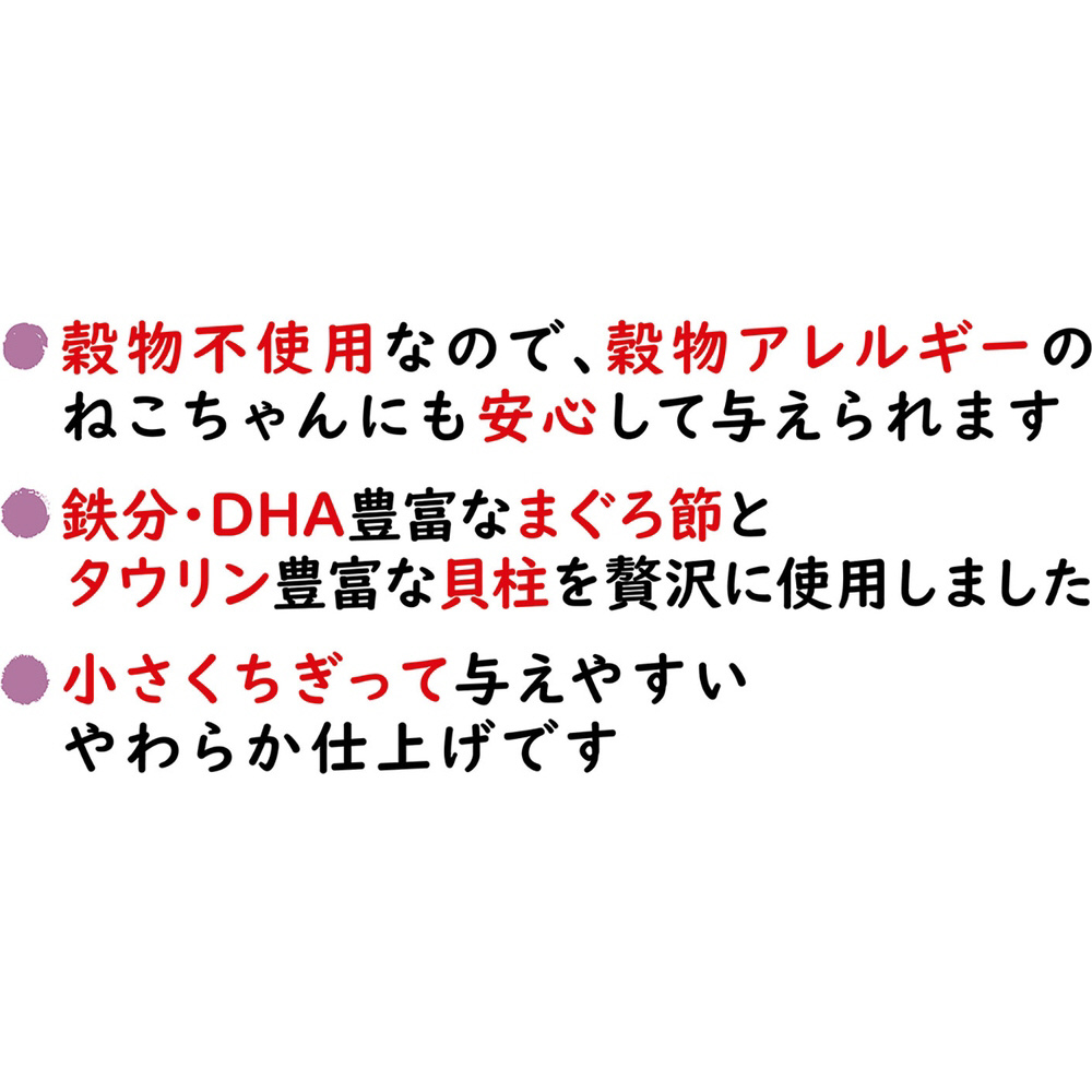 ・まぐろ節と貝柱のみを使用し、うすく焼き上げました。穀物不使用なので、穀物アレルギーのねこちゃんにも安心して与えられます。鉄分、DHA豊富なまぐろ節とタウリン豊富な貝柱を贅沢に使用しました。小さくちぎって与えやすいやわらか仕上げです。天然素材100%使用。食品添加物無添加。