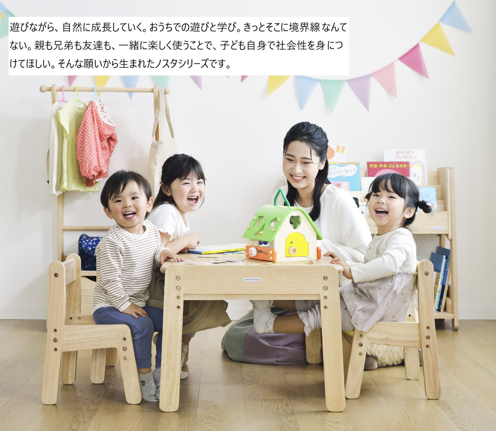 みんなで使える大きなサイズのテーブル。向き合って遊んだり、お絵かきしたり。成長に合わせ高さを3段階に調整できます。キッズチェアを使うと高さもぴったりで、2脚横並びに入ります。テーブルのどちらからでも使用できるオープン棚です。