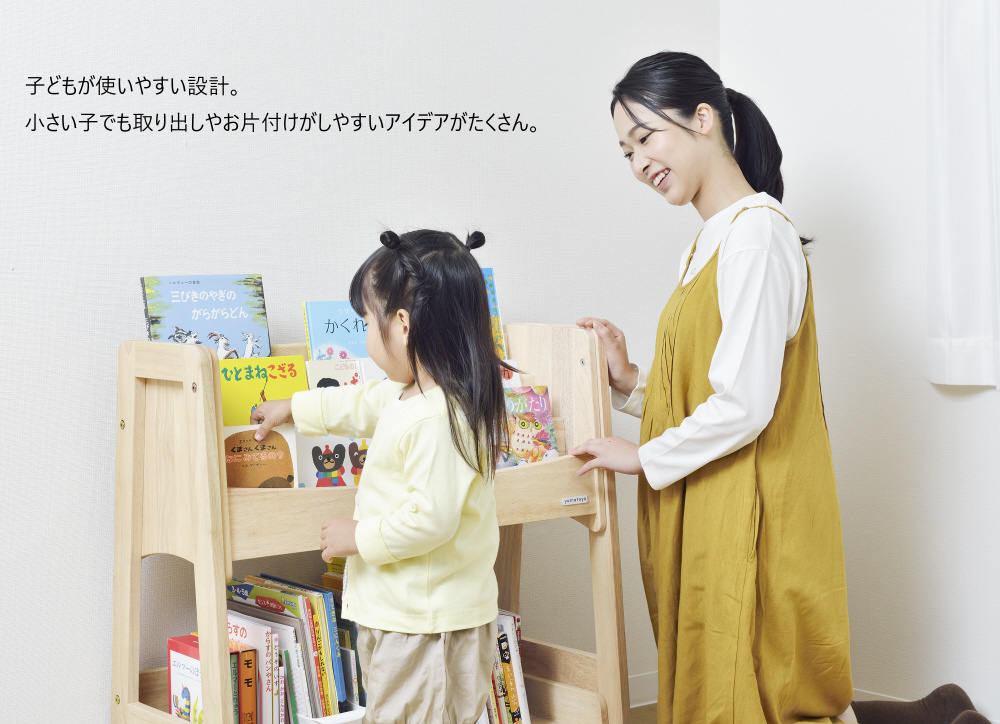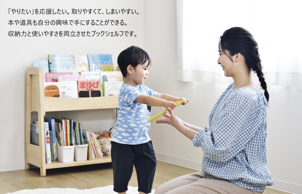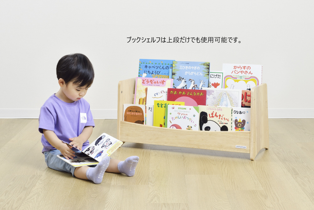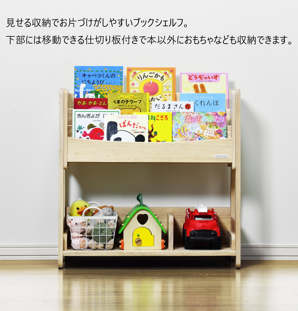 上部は本の表紙を見せて収納できるので、自分で本を選んで取って、お片付けまでしやすい。下部には本だけではなく、おもちゃも置けて収納力たっぷり。仕切り板が移動できるので、ご家庭にあわせた収納ができます。