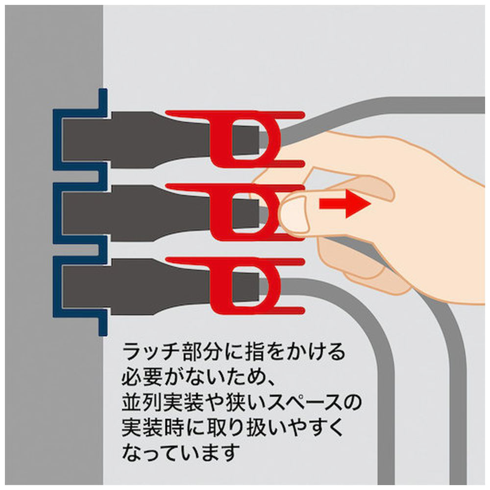 ■ロックプラス式のレバーは取り外し易いデザインとなり、PDUへの並列実装や狭いスペースへの実装に適しています。