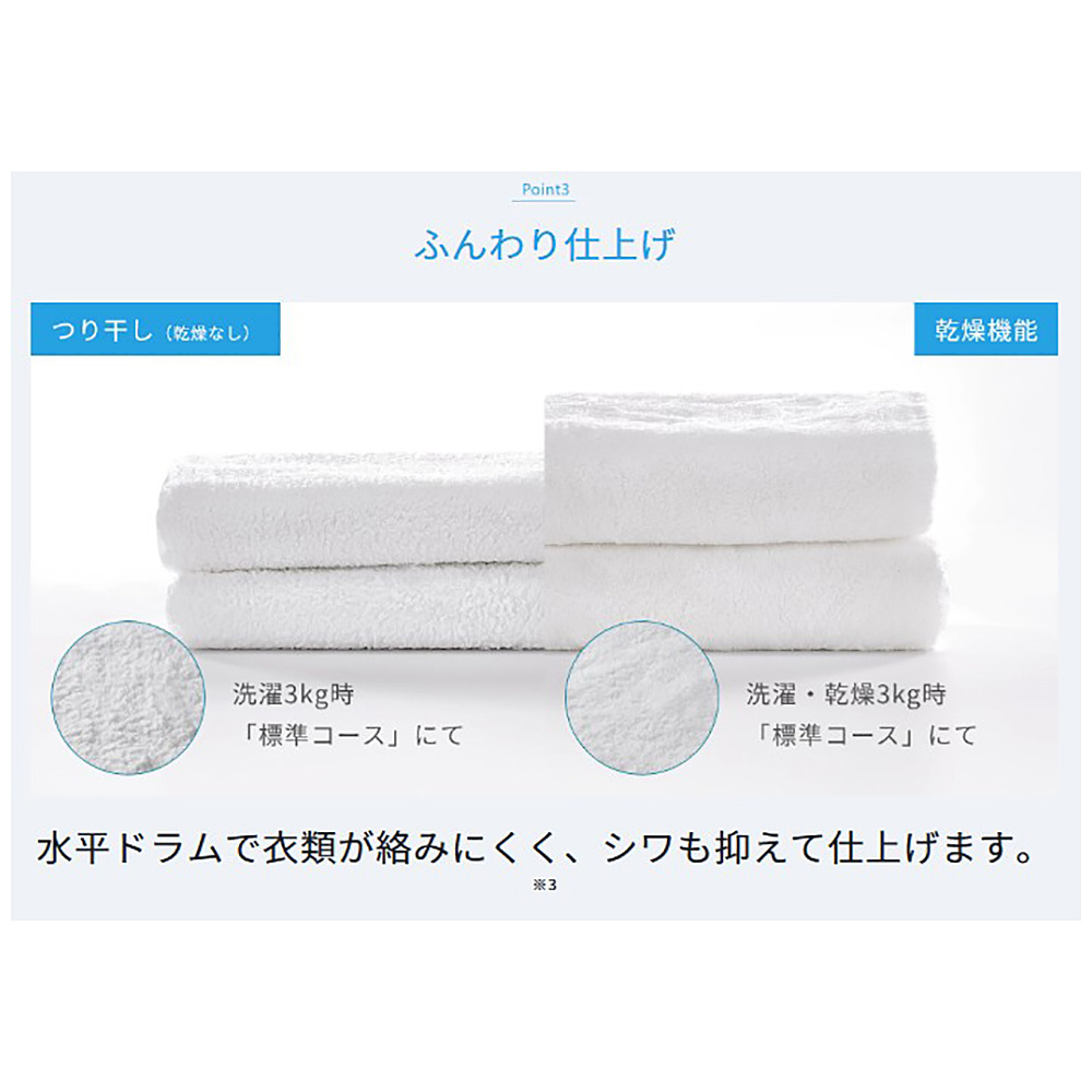 ■「ふんわりシワ取り」コースでは、完全に乾燥させずに乾燥運転を終了し、つり干しすることでタオル類をふんわり仕上げることができます。