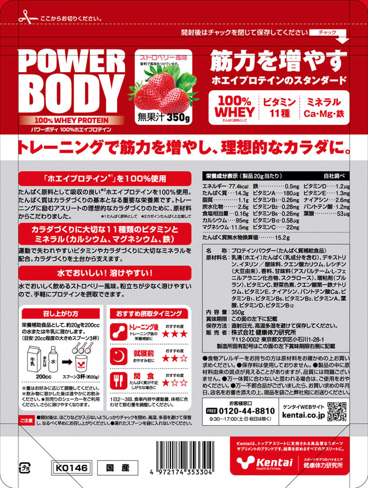 【軽減税商品】パワーボディ100%ホエイプロテイン ストロベリー風味 350g K0146