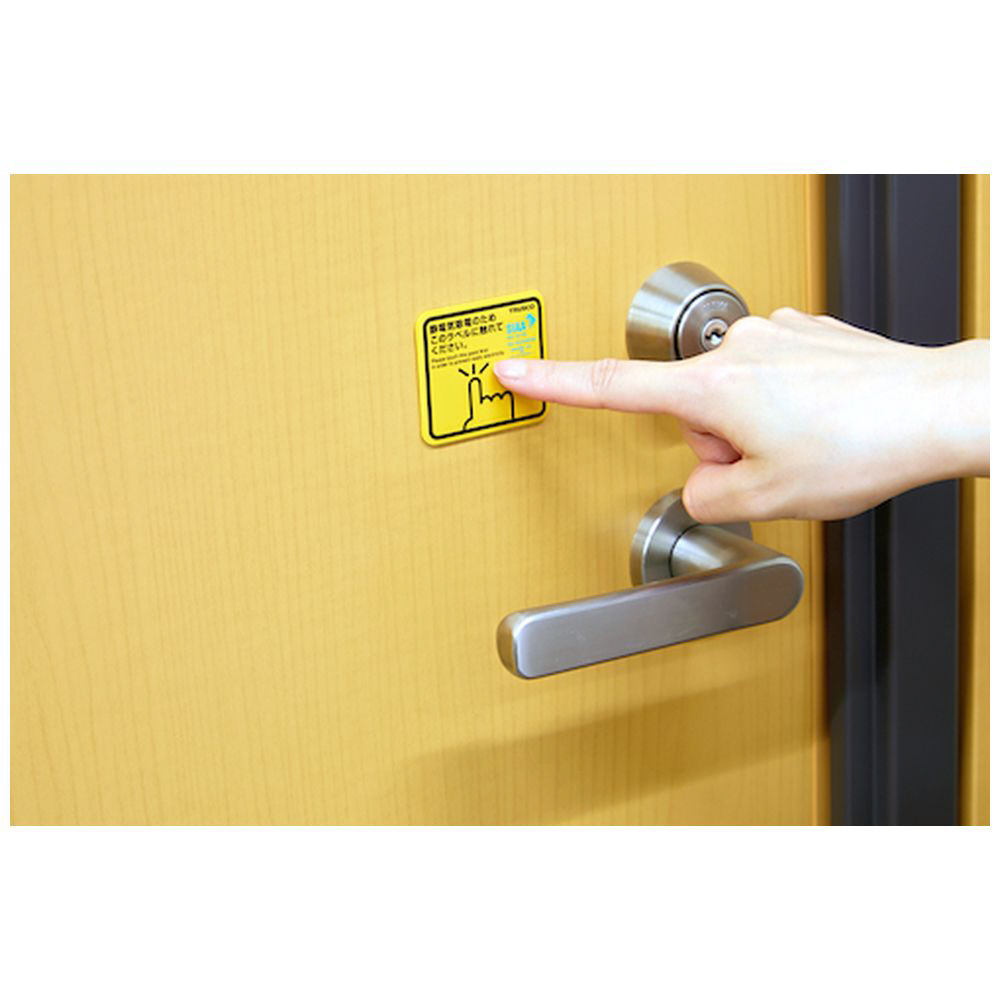 工場・ホテル・エレベーター・一般家庭・事務所などのドアをはじめ、あらゆる金属部分に貼り付け、触れるだけで体に溜まった静電気を除去します。