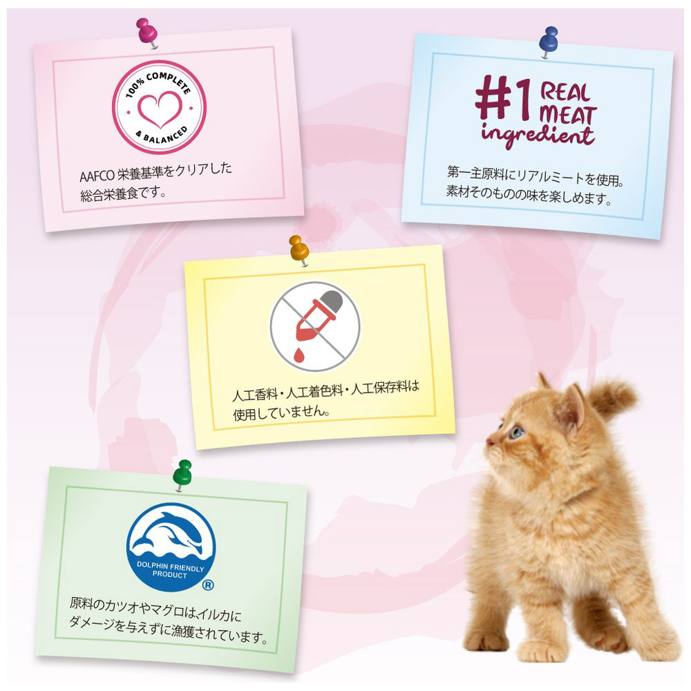 ・リアルミートを第一主原料とし、AAFCO基準をクリアした人工着色料、香料、防腐剤不使用のおしいレシピ。