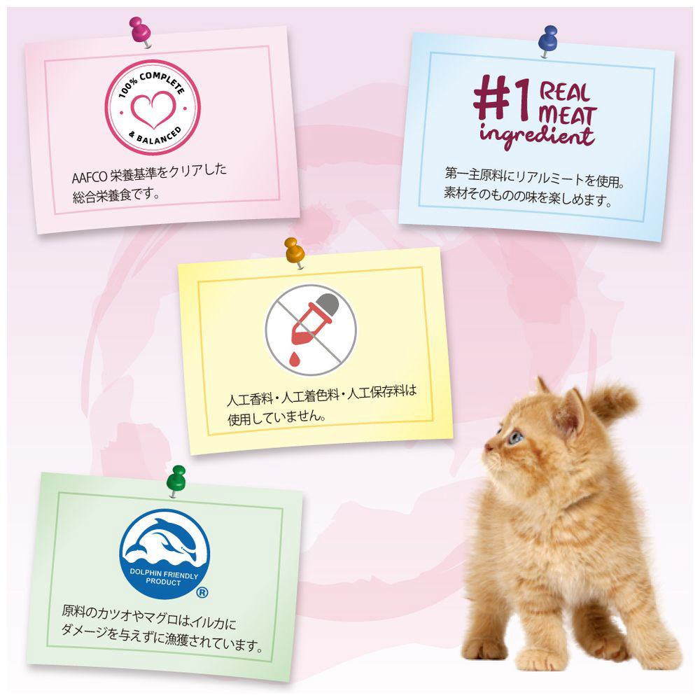 ・リアルミートを第一主原料とし、AAFCO基準をクリアした人工着色料、香料、防腐剤不使用のおしいレシピ。