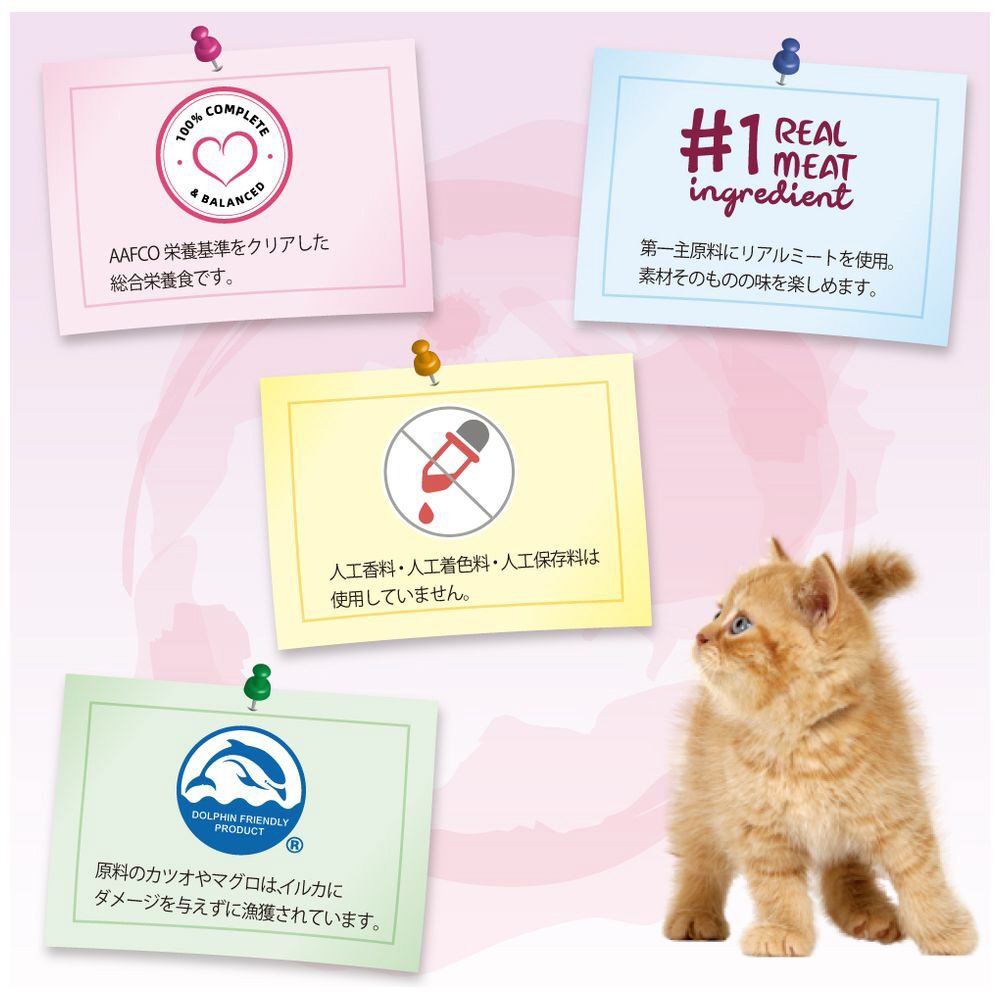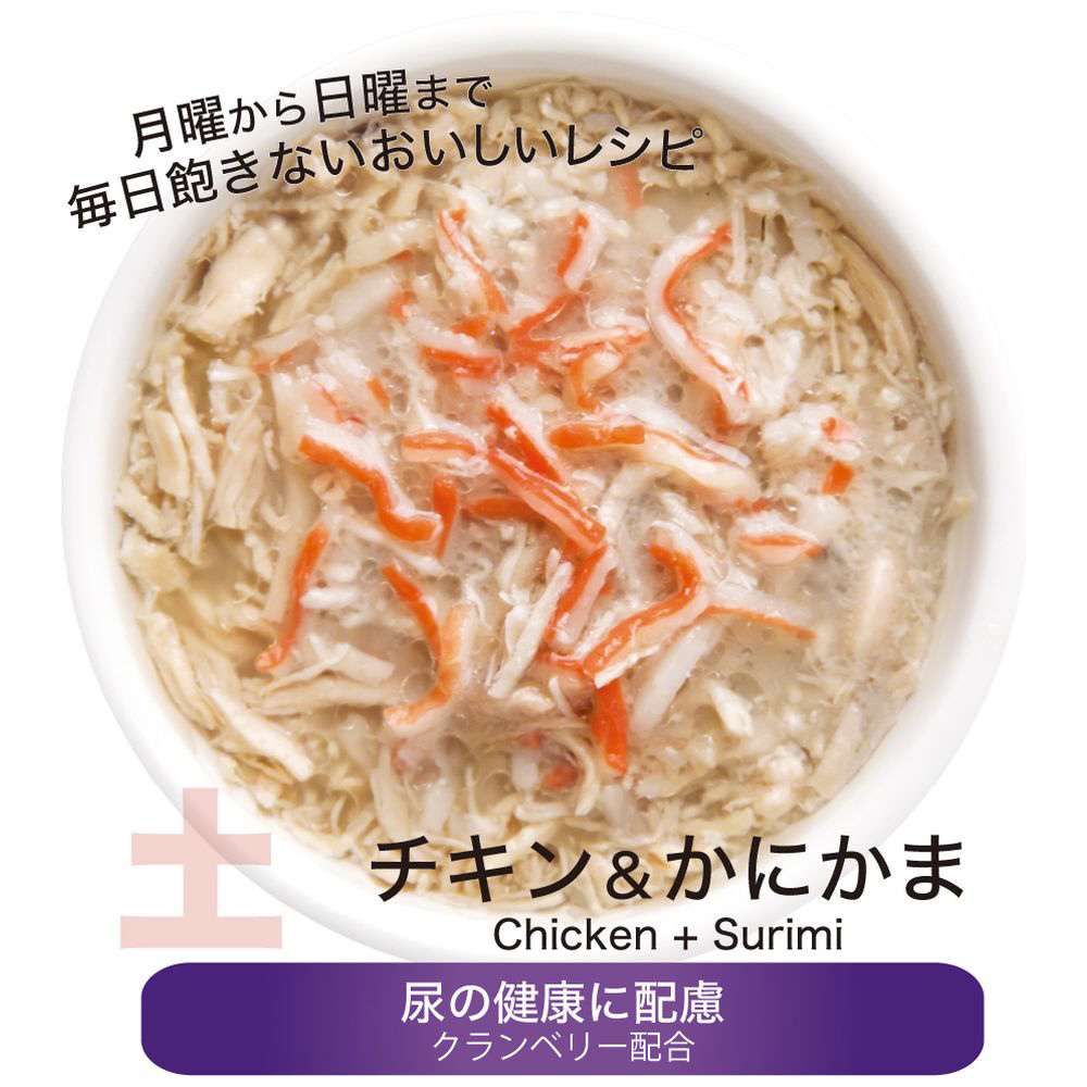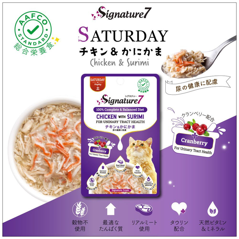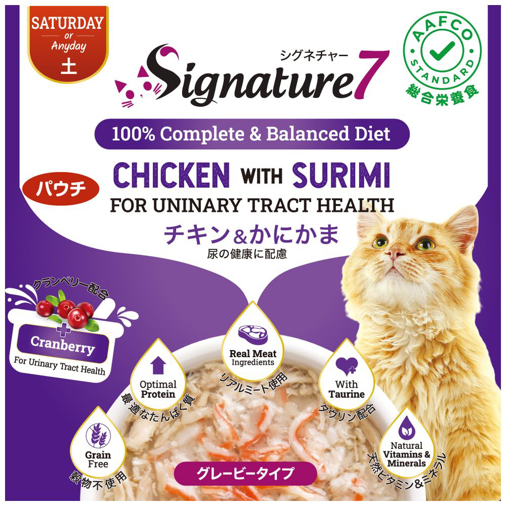 ・オールステージ・猫用総合栄養食「シグネチャー7」穀物不使用のパウチタイプ。・素材のエキスが溶け込んだスープが多めのグレービータイプ。・穀物不使用でアレルギーに配慮。・リアルミートを第一主原料とし、AAFCO基準をクリアした人工着色料、香料、防腐剤不使用のおしいレシピ。・『チキン&かにかま』クランベリー配合で尿の健康に配慮しています。