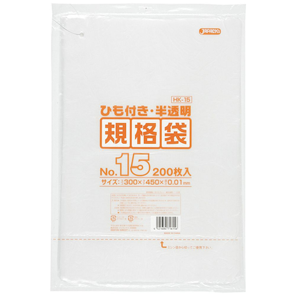 ジャパックス HD規格袋 No.15 紐付き200枚 半透明 厚み0.01mm HK15
