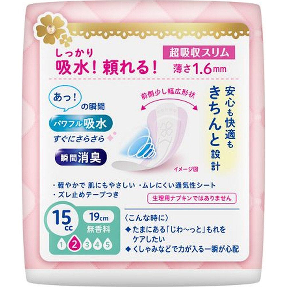 もしもの時も安心、「女性のおまもり」さらピュア吸水から、しっかり吸収!頼れる超吸収スリム。超薄1.6mmつけてる感ゼロへ。パワフル吸水で水分をしっかり吸引!すぐにさらさらずっとさらさら。瞬間消臭。ムレにくい全面通気性シート。前側ちょこっと幅広の快適&安心きちんと設計。