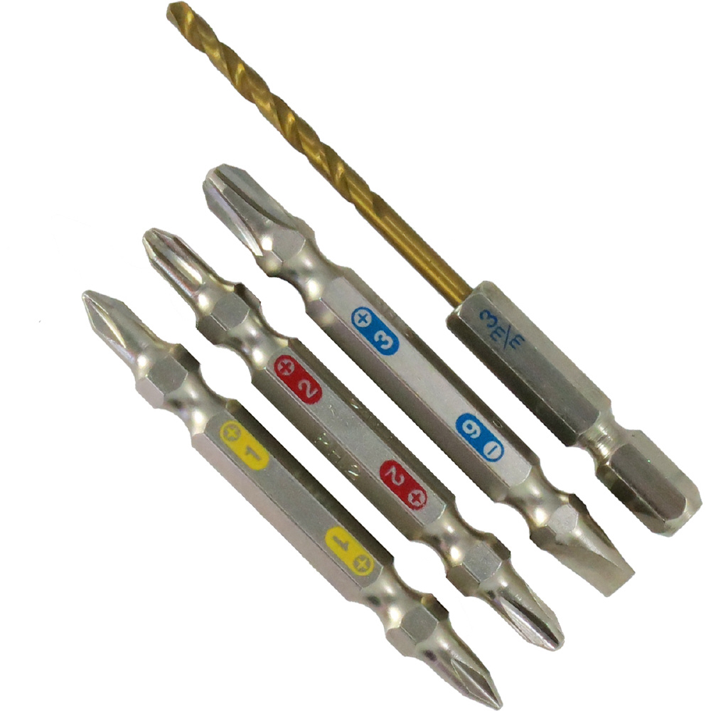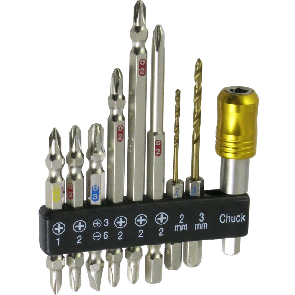 セット内容:両頭ドライバービット+No.1×65mm・+No.2×65mm・+No.3/-6×65mm・+No.2×85mm・+No.2×110mm、段付ドライバー+No.2×100mm、HSS鋼ドリル刃2mm・3mm、ワンタッチチャック6.35mm、収納ホルダー