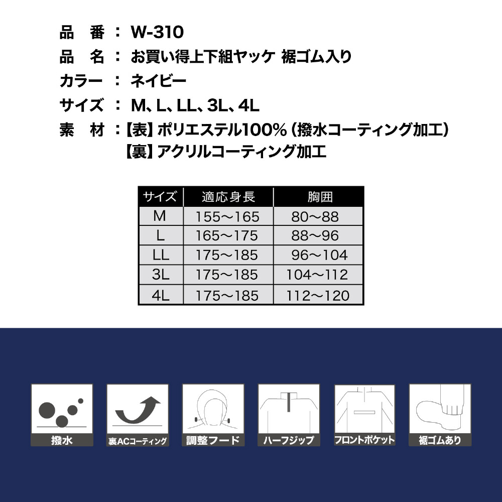 裾ゴム入りお買い得上下組ヤッケ ネイビー LL W-310 NV LL ネイビー W-310