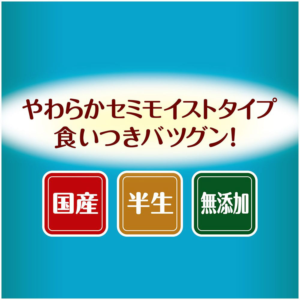 「すこやかな健康維持」を願うアダルトのために4つ(お腹、皮膚・毛づや、健康な便通、健康で元気なカラダ)の健康維持サポート。やわらかセミモイストタイプ、食いつきバツグン!生の白身魚と野菜を使った2層タイプ。小袋タイプでお試しにも最適!