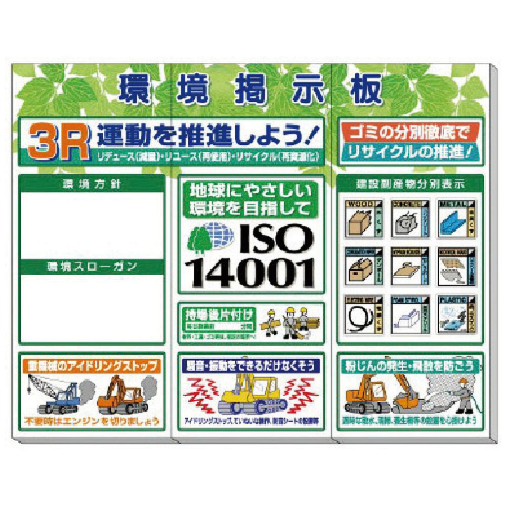 ・表示内容: 環境掲示板・3R運動を推進しよう!環境方針・環境スローガン・重機械のアイドリングストップ・地球にやさしい環境を目指して・持場後片付け・騒音振動をできるだけなくそう・ゴミの分別徹底でリサイクルの推進・建設副産物分別表示・粉じんの発生飛散を防ごう