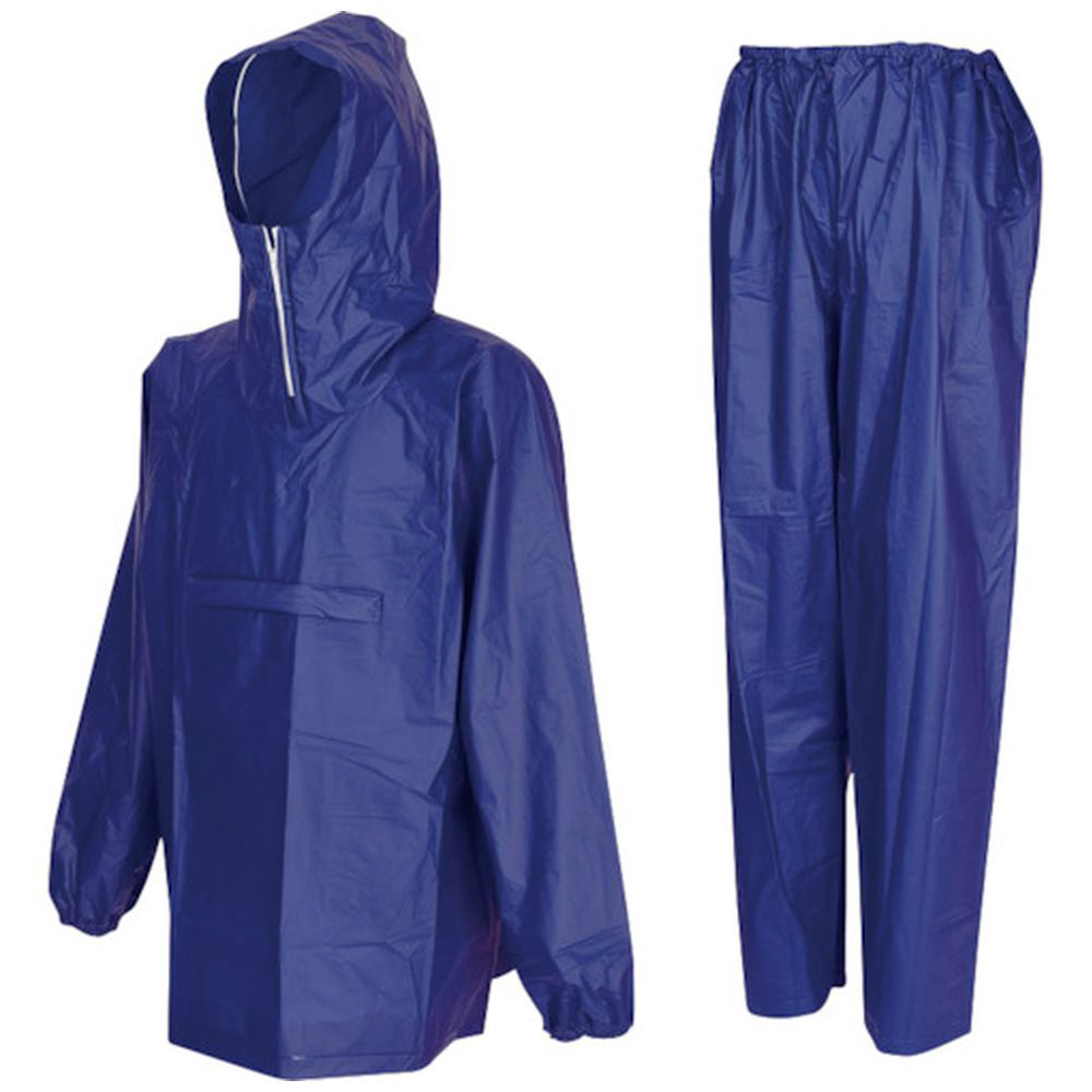 簡易な用途に向く代表的なシンプルで使いやすい定番の上下セパレートタイプのヤッケの形をしたレインスーツ。