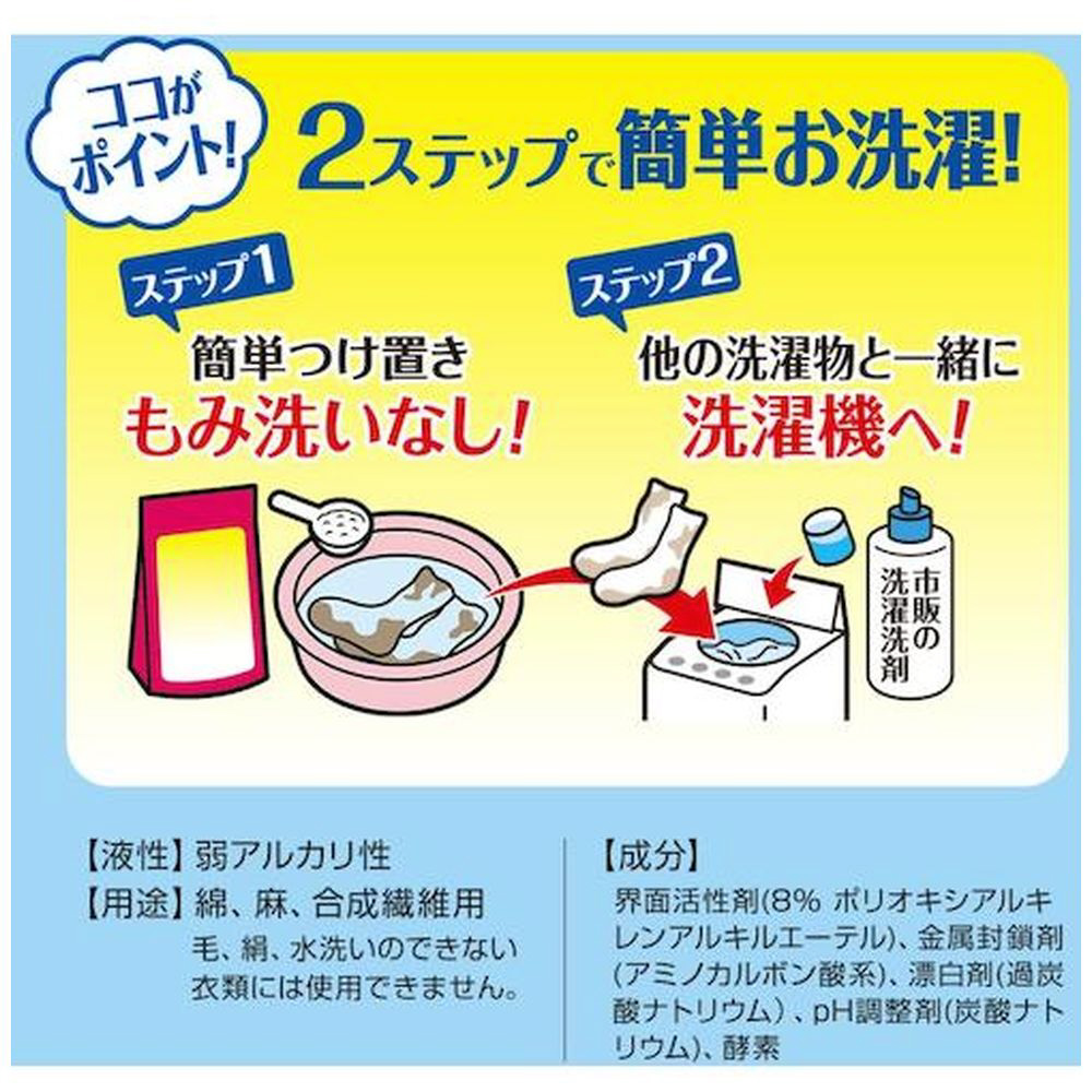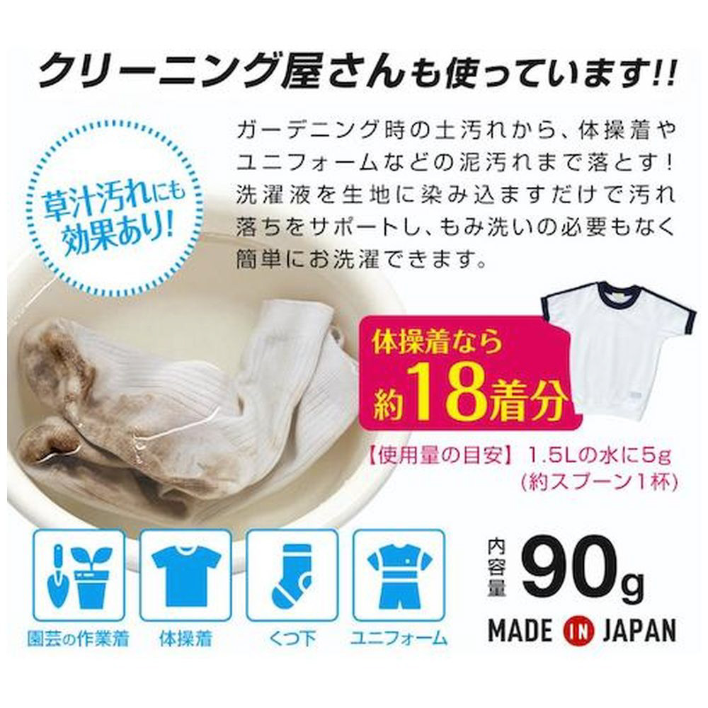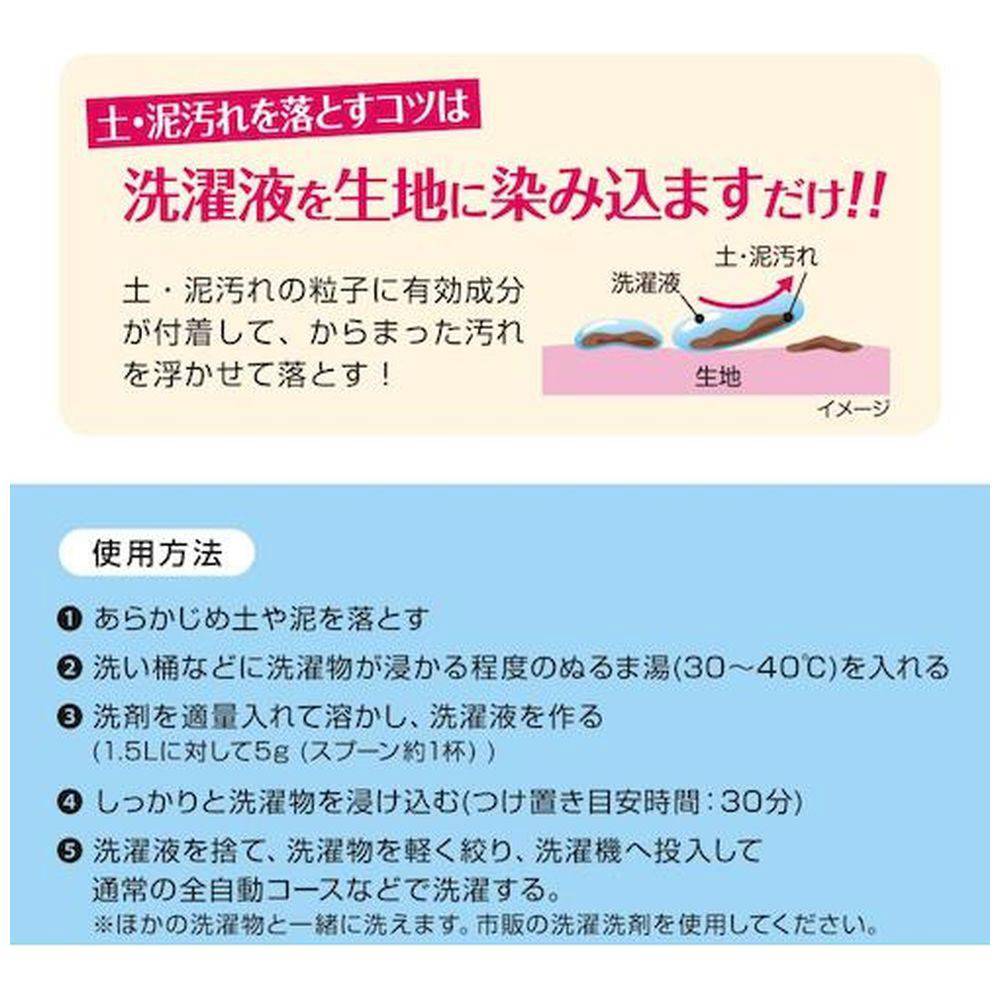 ■2ステップで簡単お洗濯、土・泥汚れの粒子に有効成分が付着して、からまった汚れを浮かせて落とします。