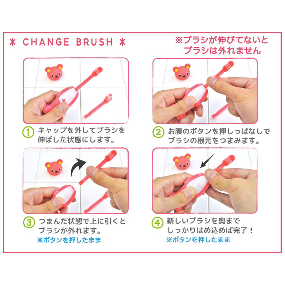 おなかのボタンを押すとブラシが飛び出す歯ブラシ。交換用ブラシ1本付き。
