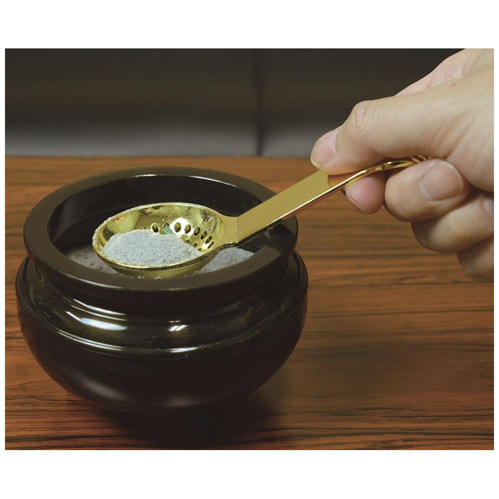 円形だからすみずみまで燃えカスを取り除けます。全面パンチングで灰が落ちやすい。使いやすい角度で、すくいやすく、香炉の中でふるいやすい。皿部分が深いのでたくさんすくえます。