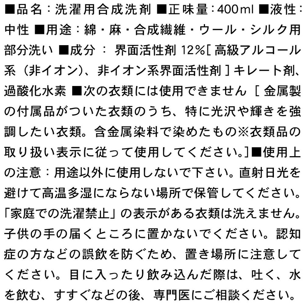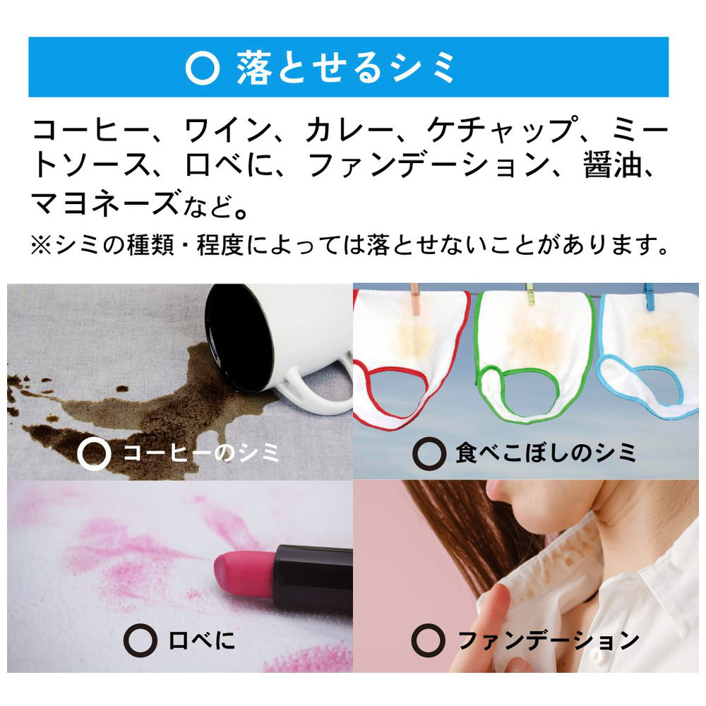 ■使用上の注意:用途以外に使用しないで下さい。直射日光を避けて高温多湿にならない場所で保管してください。「家庭での洗濯禁止」の表示がある衣類は洗えません。子供の手の届くところに置かないでください。認知症の方などの誤飲を防ぐため、置き場所に注意してください。目に入ったり飲み込んだ際は、吐く、水を飲む、すすぐなどの後、専門医にご相談ください。