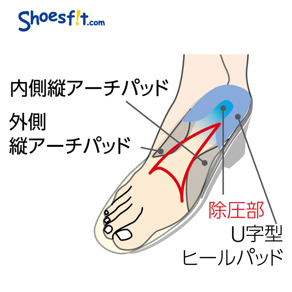 痛みが生じている「かかと中央部」を体重のかかりにくい特殊形状(除圧部)とすることで、 かかとにかかる負担を逃がします。長時間の立ち仕事でかかとに痛みを感じる方にもおすすめです