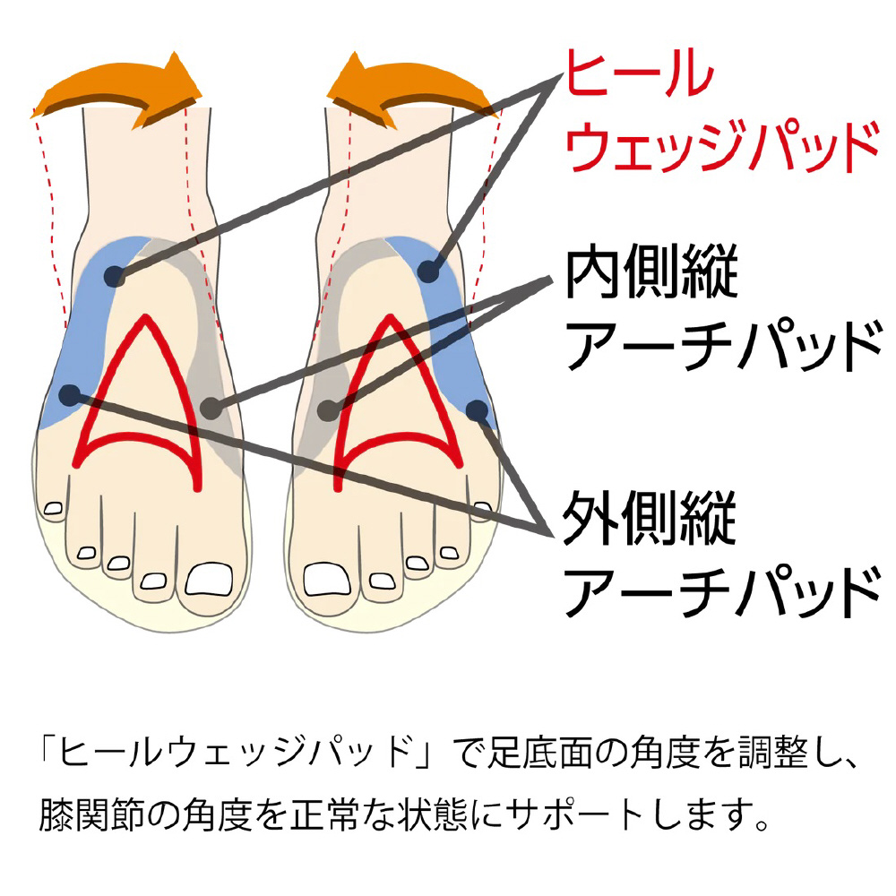 土踏まず部からかかと部にかけて、足の外側を持ち上げる「ヒールウェッジパッド」を配置しています。これにより、膝関節の角度を調整し、正常な状態へサポートします