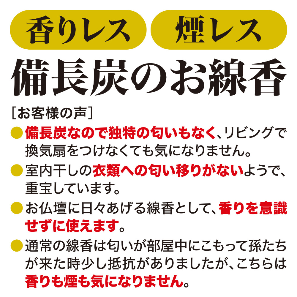 ●現代の機密性の高い住環境に適した、煙が少なく消臭成分配合の備長炭のお線香。