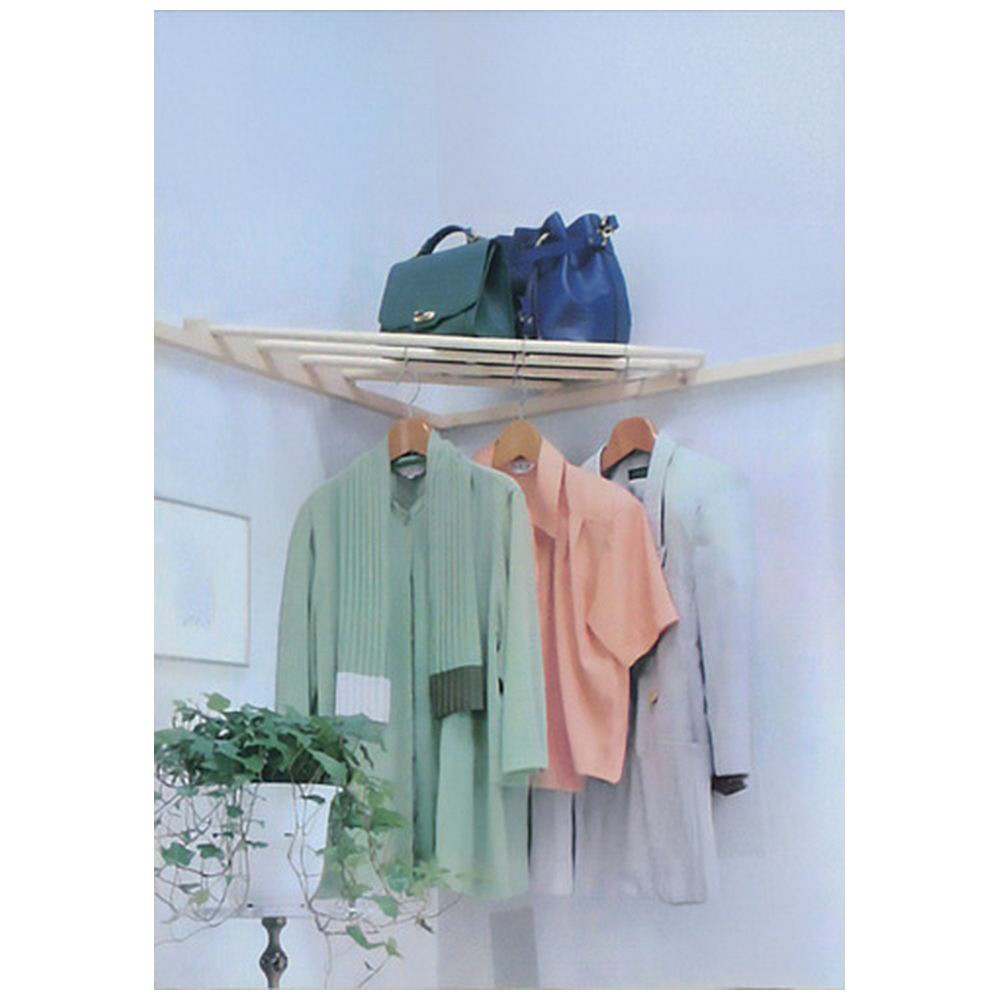 ポンとコーナーに置くだけで、棚とハンガーの2つの機能、クギを打たずに簡単に取付、かたづけ上手の便利なラックです。
