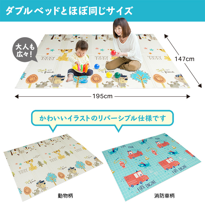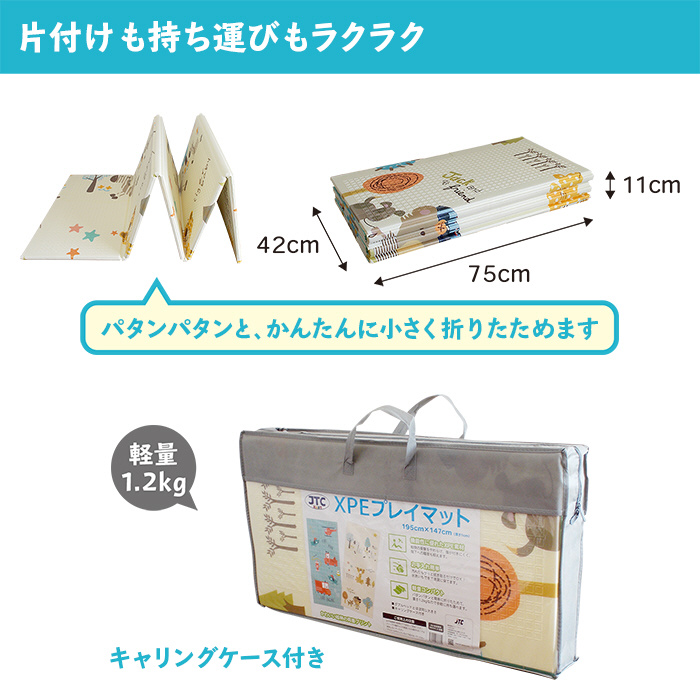 ●しっかりしたクッション性とお手入れが楽なプレイマットです。かんたんに小さく折りたためるので、気軽に収納や持ち運びができます。