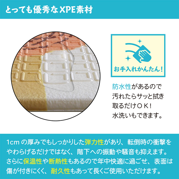 ●1cmの厚みでもしっかりした弾力性があり、転倒時の衝撃をやわらげるだけではなく、階下への振動や騒音も抑えます。