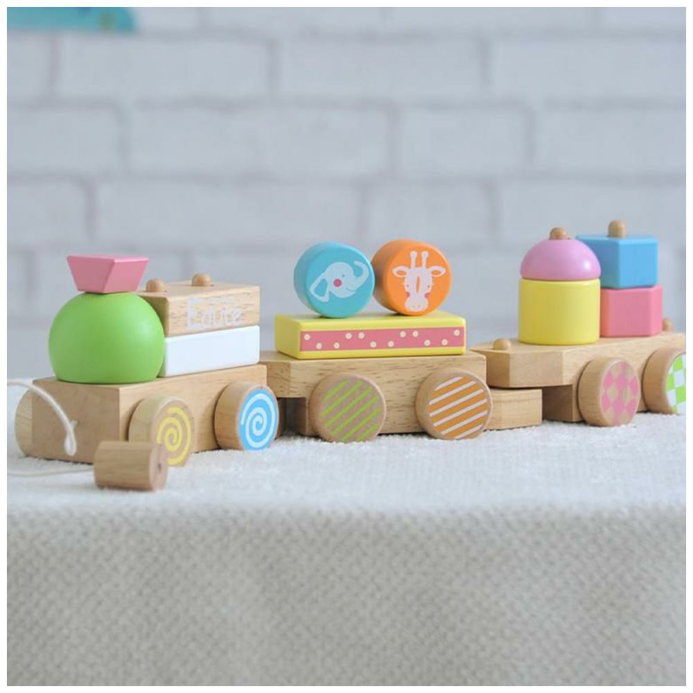 かわいい動物を乗せた三連の木のおもちゃの汽車型プルトイ!どんな方向に引っ張っても倒れにくい連結部分で、思う存分引っ張っちゃおう。