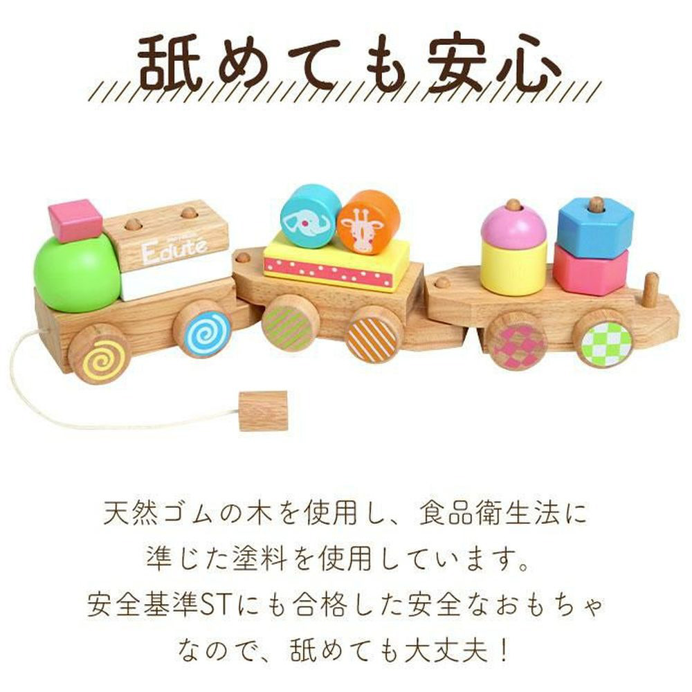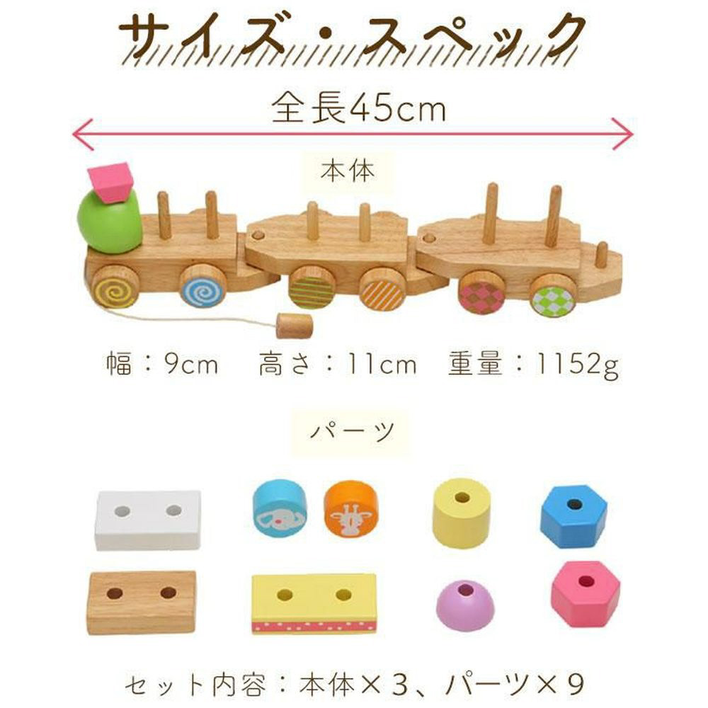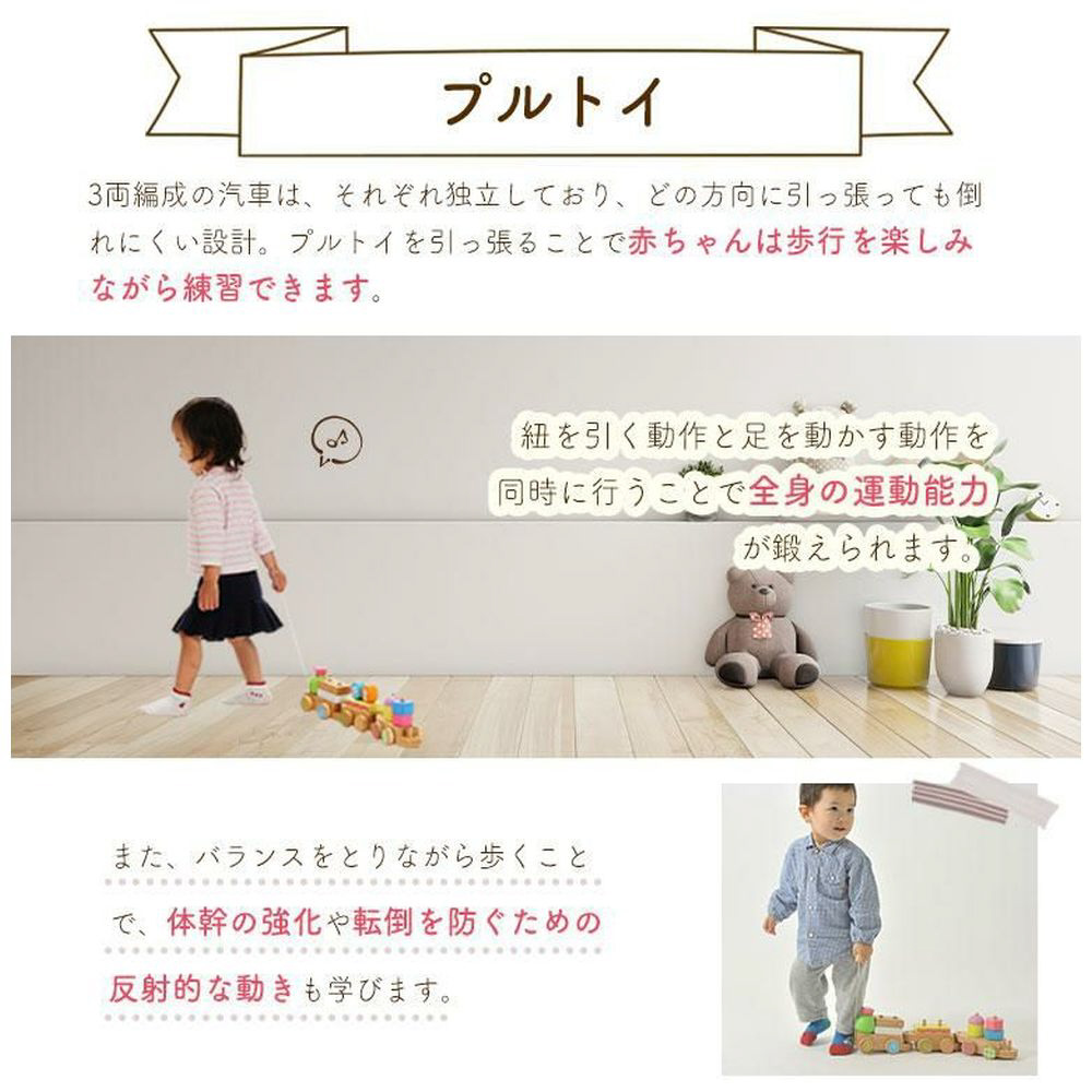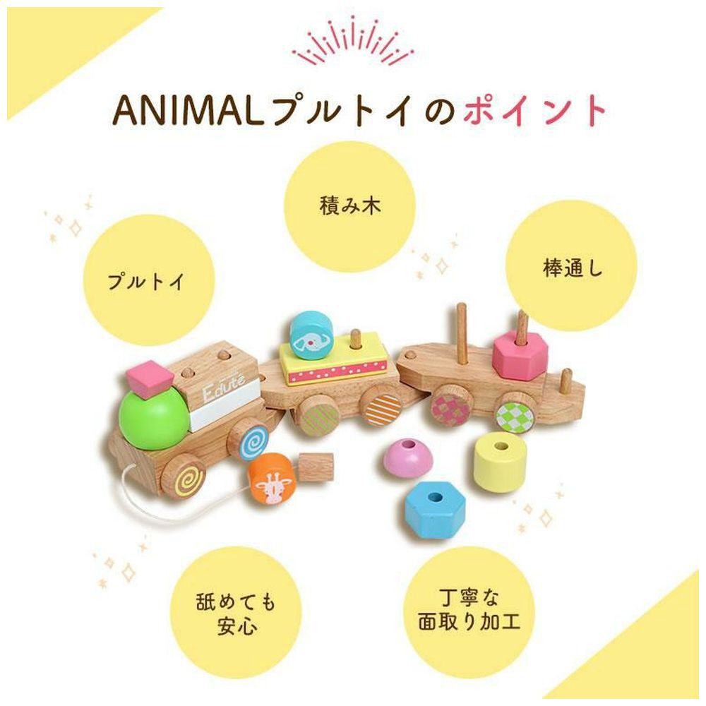 かわいい動物を乗せた三連の木のおもちゃの汽車型プルトイ!どんな方向に引っ張っても倒れにくい連結部分で、思う存分引っ張っちゃおう。荷台のブロックは積木、棒通し、カタチ分けなど知育な遊びも楽しめ、長くお遊びいただけます。